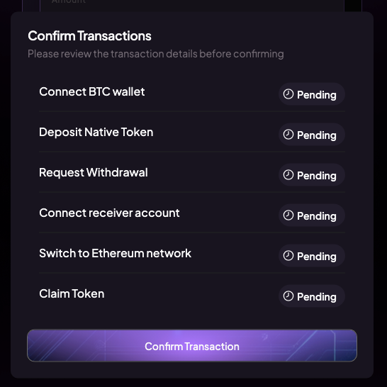 After filling out all the details and clicking on the "Bridge" button, the first step in the transaction window will be "Connect BTC wallet"