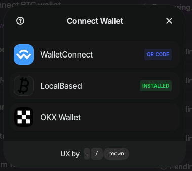 <figure><img src="https://2815539471-files.gitbook.io/~/files/v0/b/gitbook-x-prod.appspot.com/o/spaces%2FOXh9YkYsL5crs8Vl1tft%2Fuploads%2FVvlBlv2mEhazKwFX2k5Z%2FConnect%20BTC%20wallet.png?alt=media&#x26;token=8b791bf2-5508-4ca7-935f-f0c0972aad20" alt=""><figcaption></figcaption></figure>