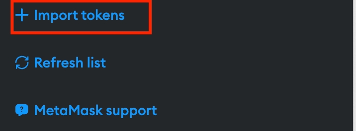 Go into your MetaMask wallet (or your preferred wallet) and scroll down to find ‘Import Tokens,’ then click on it.