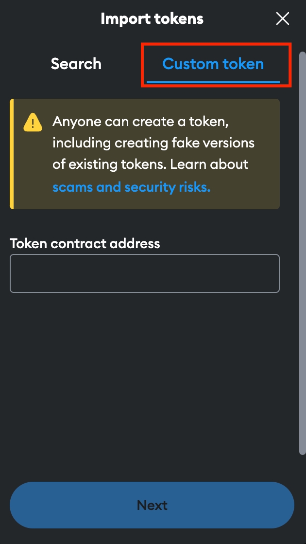 After clicking on ‘Import Tokens,’ you will see a table where you need to click on ‘Custom Token.’