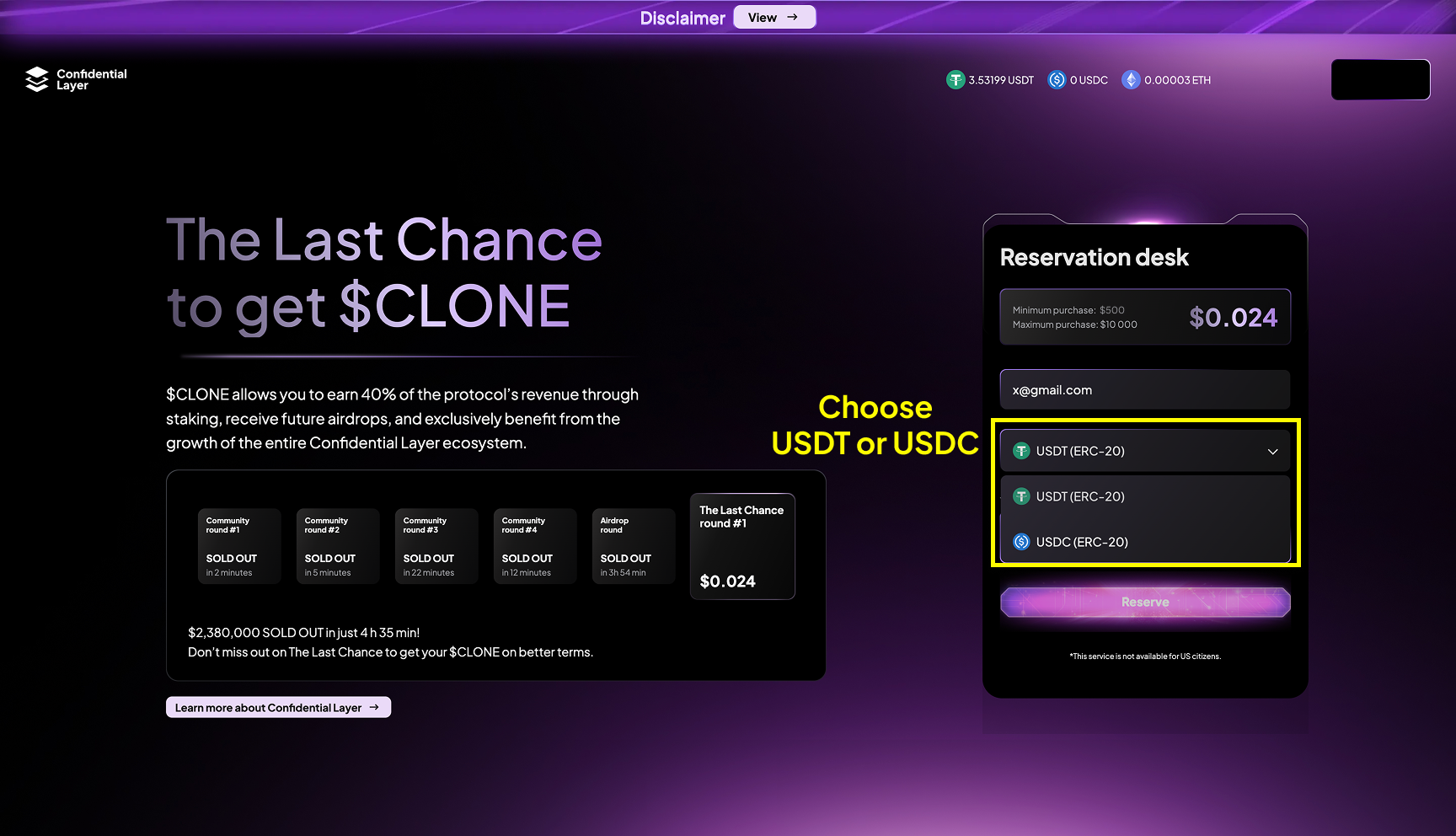 To buy/reserve CLONE, you need to have USDC or USDT on Ethereum chain and ETH for gas on your wallet.